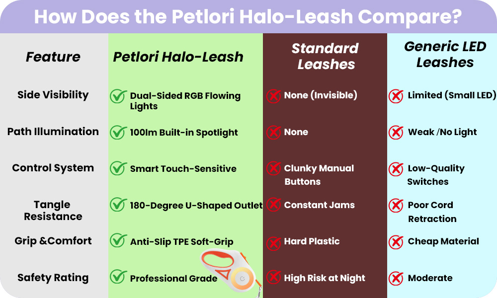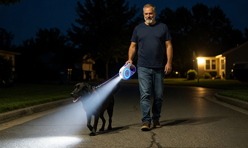 “Julie, this thing is a lifesaver. It’s a 3-in-1: a high-power spotlight, Dual-Sided safety halo, and a pro-grade retractable leash. No more lugging around extra gear. I just grab the Halo and go.”