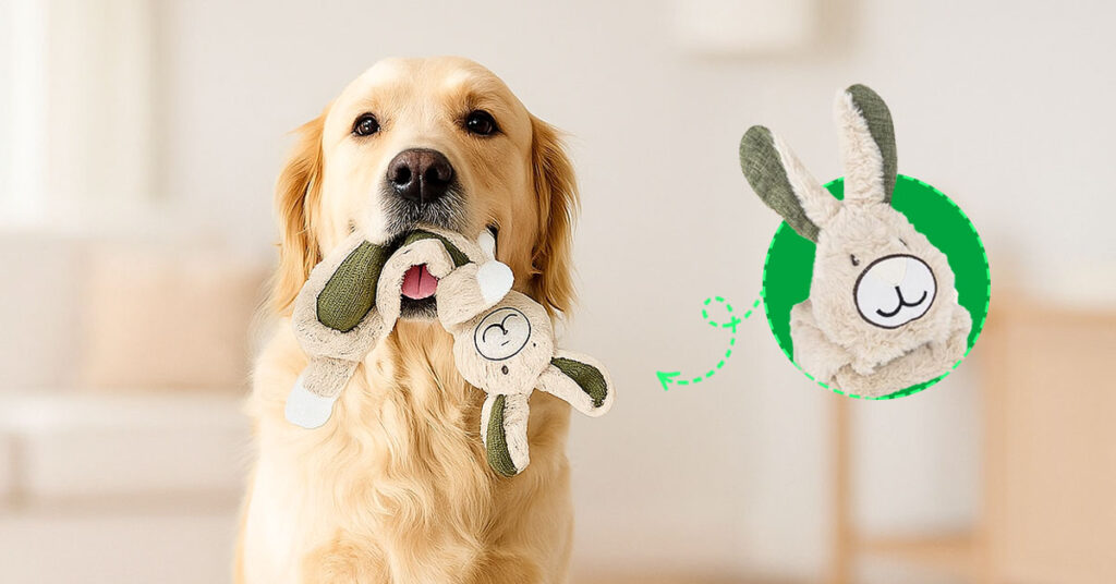 The toy is crafted from natural rabbit fur and textured burlap wrapped around a flexible inner core. This combination satisfies instinctive chewing needs, massages gums, supports dental health — and feels natural and comforting to dogs.