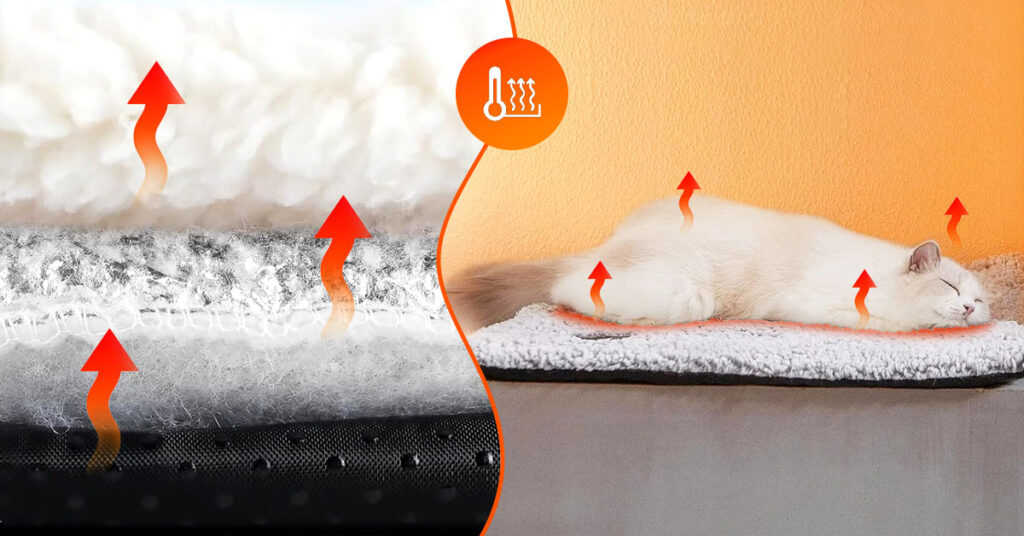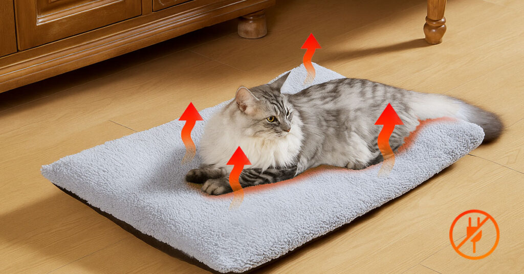 EmberNest uses a self-heating core made of a heat-responsive film and thermal insulation layer. When your cat lies down, her natural body heat is captured, amplified, and reflected back evenly across the mat. This creates a steady, soothing warmth similar to lying in a sunny window — all without cords, batteries, or plugs.