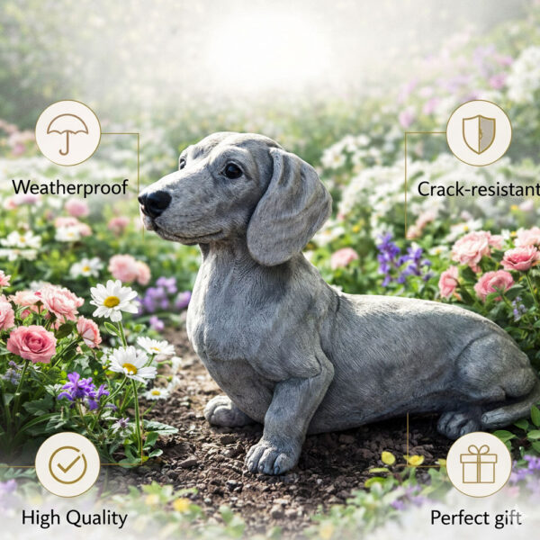 Built to endure whatever nature throws its way, this dachshund statue laughs in the face of harsh winters, scorching summers, and everything in between. The hand-applied finish resists UV rays and moisture, so those soulful gray tones and delicate details stay vibrant year after year. No need to bring it inside when the weather turns—it’s tougher than it looks.