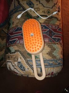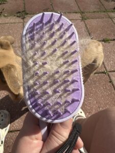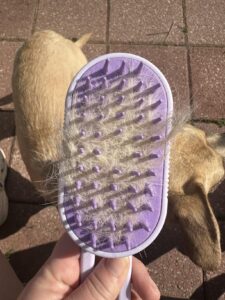 The comb features a small built-in spray (nano mist) that lightly dampens the fur, loosening debris and making it easier for the comb to glide and collect fur with less tugging.