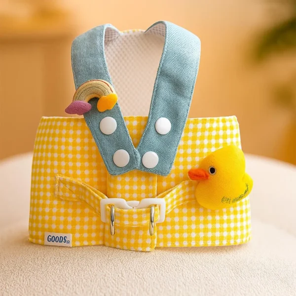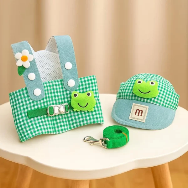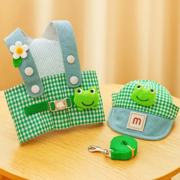 Turn the harness inside out and place it in a mesh laundry bag. Wash on gentle cycle with cold water and mild detergent. Air dry completely—the dryer can make the plush duck or frog matted and sad-looking. The hat can be spot-cleaned with a damp cloth for minor dirt. For muddy adventures, hand washing the decorative pieces separately preserves them longer.