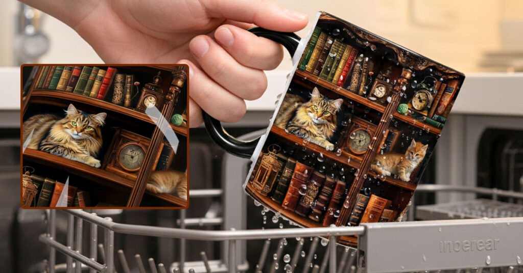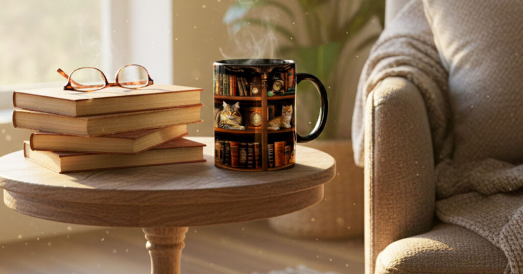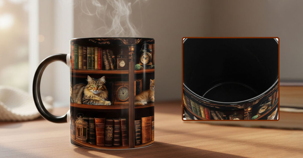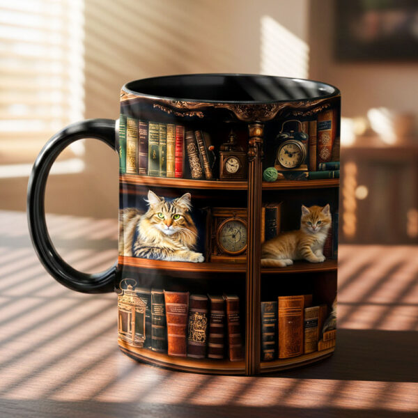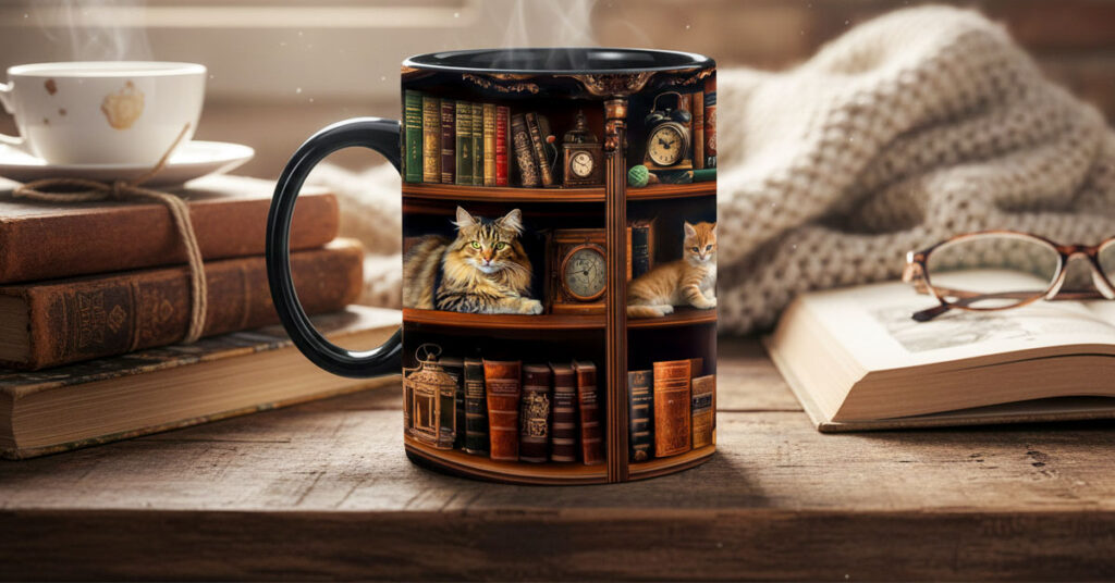 Unlike ordinary mugs, this one wraps a nostalgic, artistic scene around its surface, portraying cats amid shelves of books. It’s both decorative and functional — a conversation-starting piece of art for daily use.