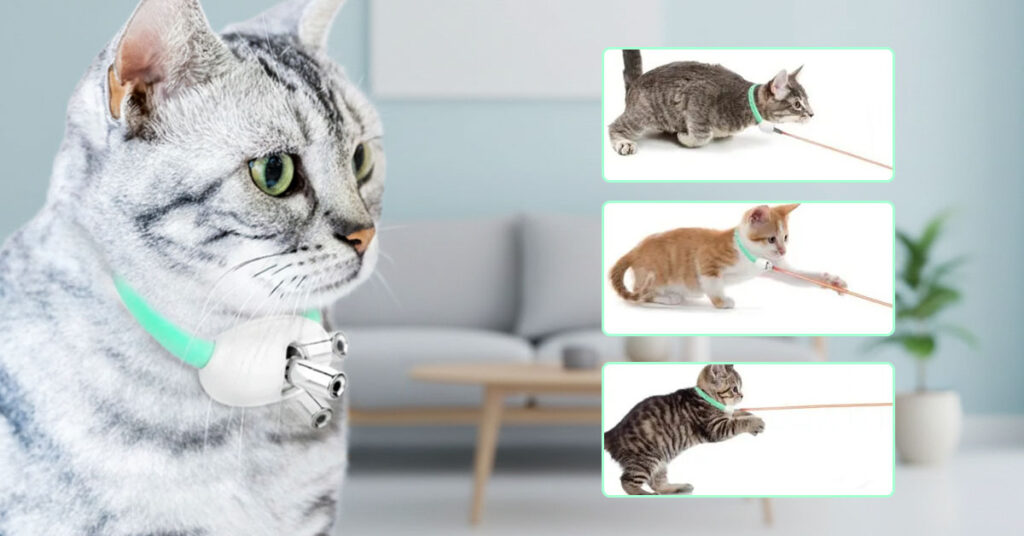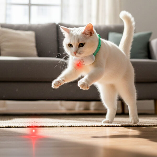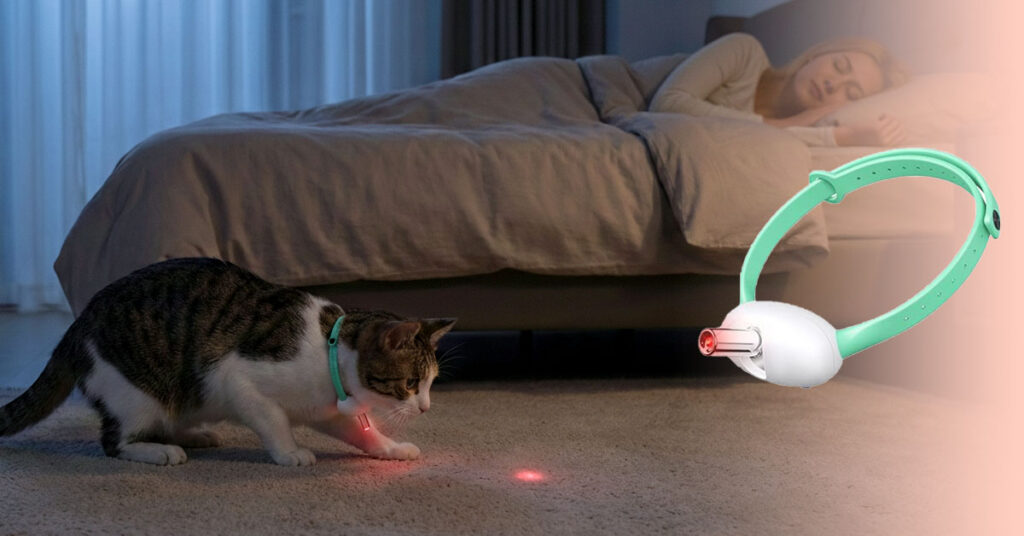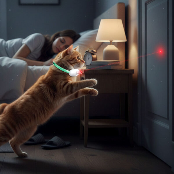 Yes. The laser is built into the collar, so it moves with your cat. Whether they’re zigzagging or jumping, the beam stays positioned just ahead of them—like a headlamp that always points forward.