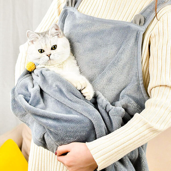 Most cats settle in within 5-10 minutes once they realize it’s warm and secure. Start by placing your cat in the pouch while sitting down, let them get comfortable with your scent and heartbeat, then gradually stand up. For cats who’ve never been carried this way, try it first during their sleepy times (after meals or in the evening). The deep pouch design and snug fleece naturally discourage jumping because it feels like a cozy nest rather than a restraint.