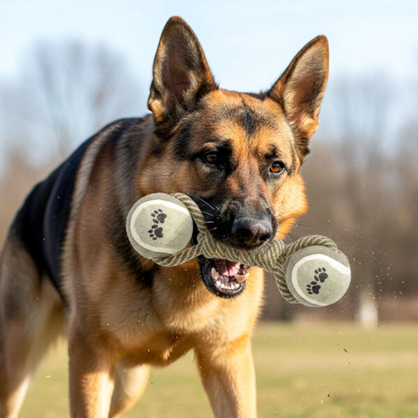 One toy that does the job of three. The weighted dual tennis balls give it serious throwing distance for fetch sessions at the park. The braided rope provides the perfect grip for intense tug-of-war battles that burn off those post-work zoomies. And the durable construction means your dog can chew on it between games without destroying it in seconds. Instead of juggling multiple toys for different moods, you’ve got one versatile option that keeps up with however your dog wants to play.