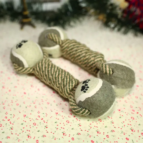 Instead of another flimsy ball, I ordered the Tuff-Tug — a heavy-duty double tennis ball rope toy.